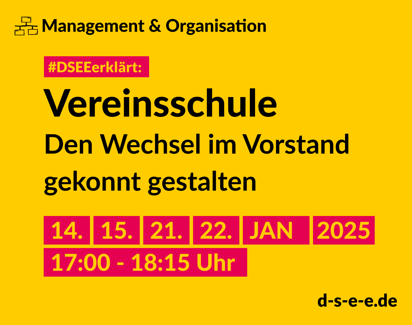Ein erfolgreicher Vorstandswechsel erfordert eine gute Vorbereitung und Strategien. Dabei geht es vor allem auch darum, einen gemeinsamen Weg zu finden und auszuarbeiten. In diesem Online-Seminar erfahrt ihr, wie Schnupperphasen, Mentoring, Hospitationen und Buddy-Systeme interessierten Personen einen praxisnahen Einblick in die Vorstandsarbeit ermöglichen. Wir zeigen, wie diese Formate den Übergang erleichtern und wie ein durchdachter Einarbeitungsplan einen reibungslosen Start für den neuen Vorstand sicherstellt.