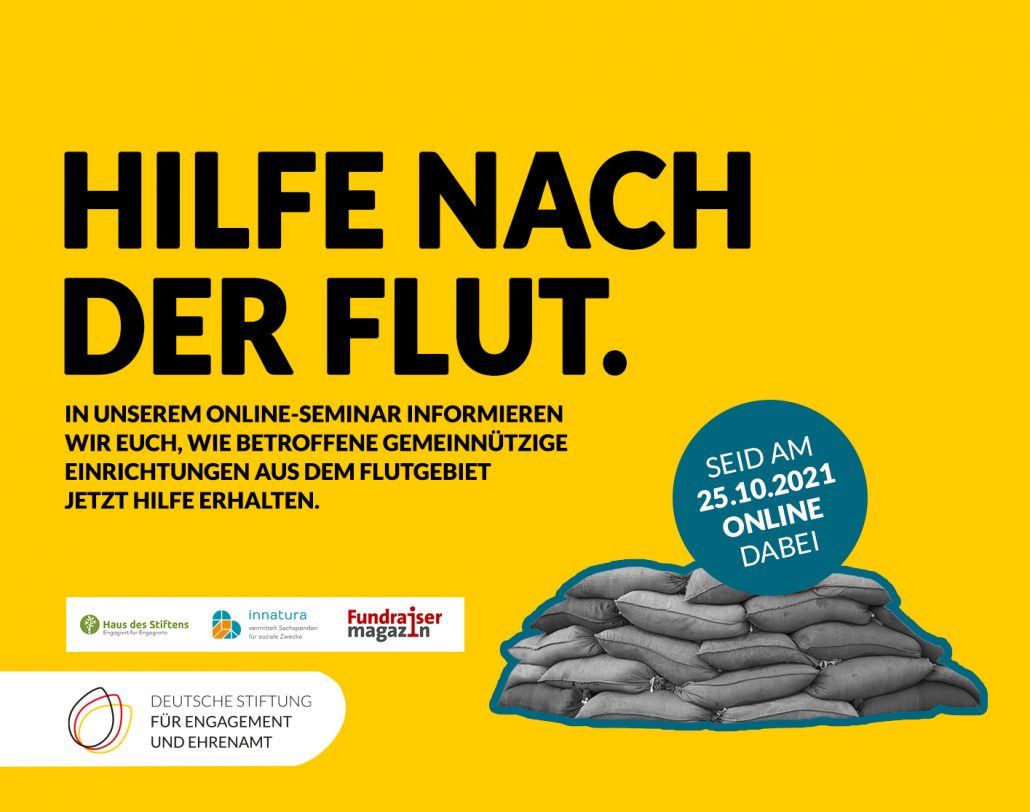 Neustrelitz, 20. Oktober: Die Hochwasserkatastrophe in Deutschland fordert auch Engagement und Ehrenamt stark heraus, viele lokale und regionale Vereine, Organisationen und Einrichtungen sind von Flutschäden betroffen. Die Deutsche Stiftung für Engagement und Ehrenamt (DSEE) führt deshalb am 25. Oktober 2021 von 17:00 bis 20:00 Uhr eine Online-Informationsveranstaltung „Fluthilfe für gemeinnützige Organisationen“ durch.