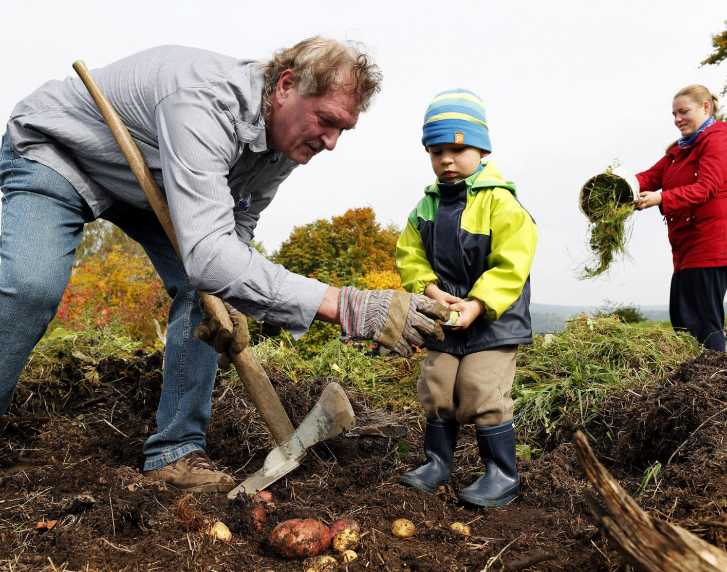 Ein Mann und ein Junge ernten Kartoffeln