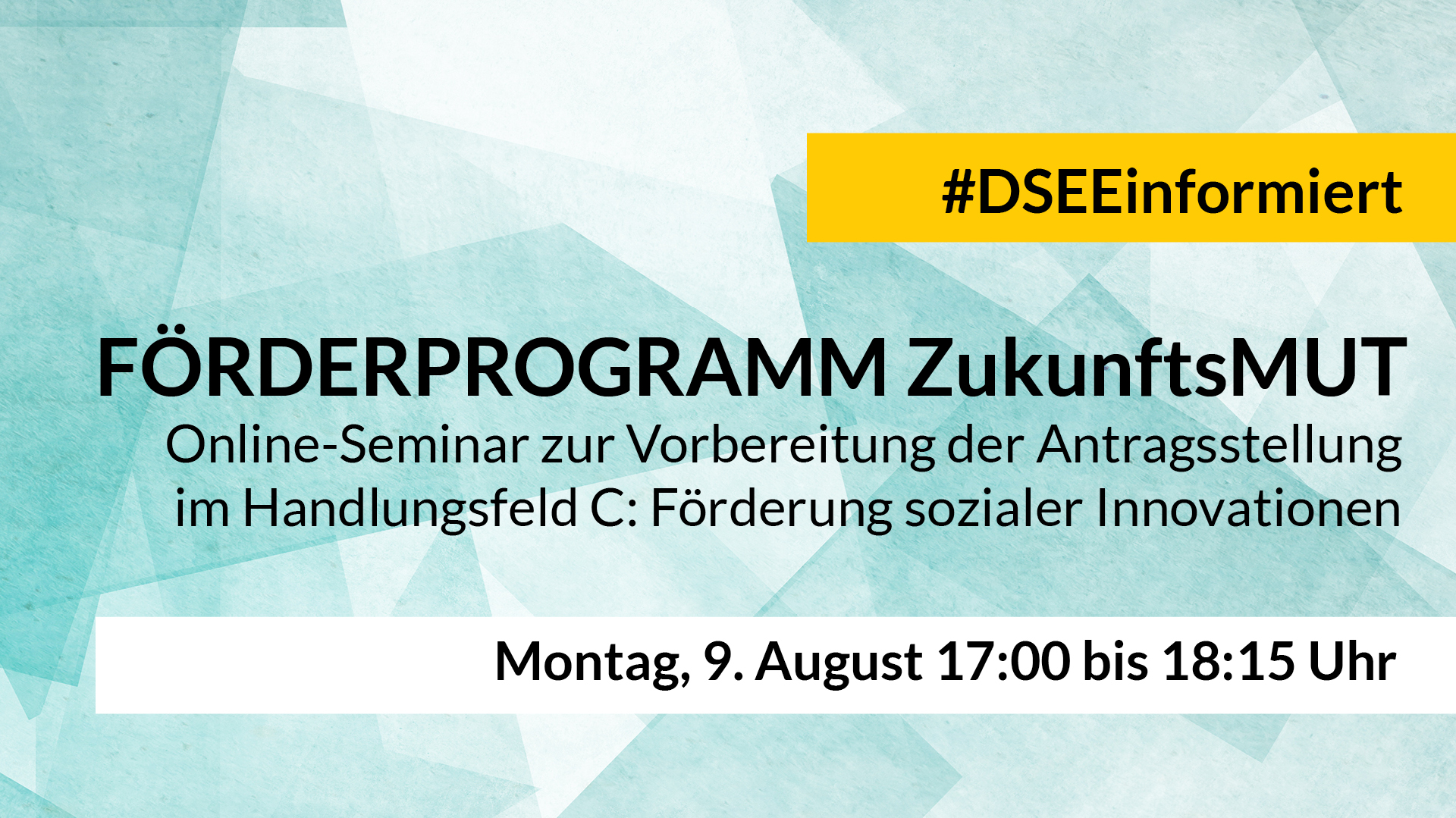 Das gemeinsame Webinar der DSEE mit der Stiftung Bürgermut liefert einen Überblick zum Handlungsfeld C des Programms ZukunftsMUT. Neben den Themen Skalierung und Verbreitung stehen Antworten und Hinweise unter anderem zur Antragsberechtigung und zur Antragstellung im Mittelpunkt der Veranstaltung.