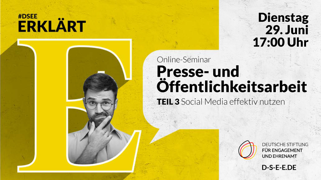 Der dritte Teil unserer Online-Seminarreihe #DSEEerklärt Presse- und Öffentlichkeitsarbeit vermittelt Grundkenntnisse für die Kommunikation in Social Media. Sie erfahren, welcher Social-Media-Kanal sich für welche Information eignet und wie moderne Formate einfach umgesetzt werden. Denn am Ende kommt es auf das „Social“ an. Und wenn die Arbeit Spaß macht, überträgt sich das auch auf die Empfänger:innen.