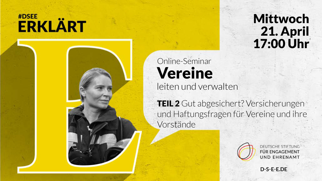 Engagiert? Aber sicher! Wer sich ehrenamtlich engagiert, denkt oft nicht daran, dass Engagement auch mit Risiken verbunden ist. Arbeitsunfälle im Ehrenamt, Haftpflichtversicherungen, Absicherung von Vorständen: Das Online-Seminar verdeutlicht anhand von Beispielen aus der Praxis, gegen welche Risiken Vereine und Vorstände sich absichern sollten und welche Versicherung wo greift.