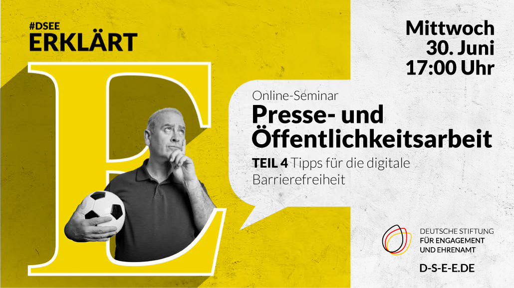 Im vierten und letzten Teil unserer Online-Seminarreihe #DSEEerklärt Presse- und Öffentlichkeitsarbeit erfahren Sie, wie Sie Barrieren in der Kommunikation im Internet abbauen. Da jede zehnte Person in Deutschland mit einer Behinderung lebt, ist die Wahrscheinlichkeit groß, Ihr Team und Publikum zu erweitern. Und jede abgebaute Barriere hilft allen weiter! Im Seminar geht es um Fragen wie: Wie werden meine Texte verständlicher? Wie können auch blinde Menschen meine Bilder erleben? Wie ermögliche ich auch Teilhabe in meinen Online-Veranstaltungen? All diesen Fragen gehen wir in dem Seminar auf den Grund.
