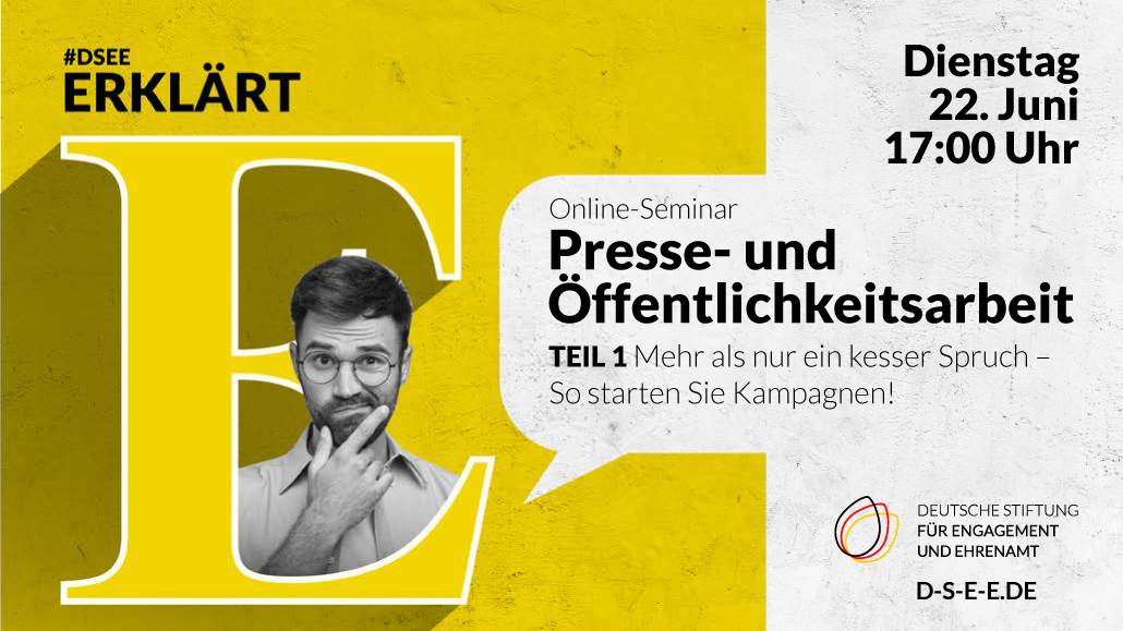 In unserer neuen Online-Seminarreihe #DSEEerklärt Presse- und Öffentlichkeitsarbeit gibt es im ersten Teil eine erste Orientierung, wie sich Vereine und ehrenamtliche Initiativen auf eigene Kampagnen vorbereiten: Welche Geschichte möchte ich erzählen? Wie nutze ich für meine Botschaften eine geeignete Text- und Bildsprache? Was sind gute Hashtags? Während des Seminars bekommen Sie Einblicken in die Kampagnen des Sozialhelden e.V.