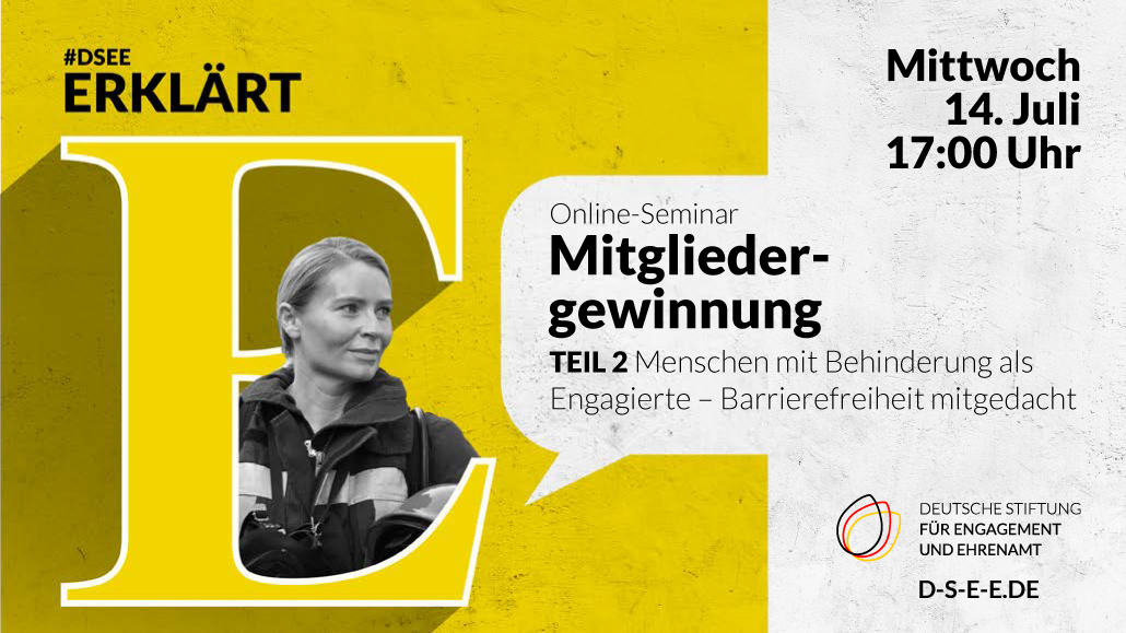 Im zweiten Teil unserer DSEE-Online-Seminarreihe Mitgliedergewinnung geht es um Menschen mit Behinderung als Engagierte. Oftmals sind es Argumente wie „Es bewirbt sich ja keiner“ oder „Wir kennen niemanden“, warum Menschen mit Behinderungen nicht Teil eines Teams sind.