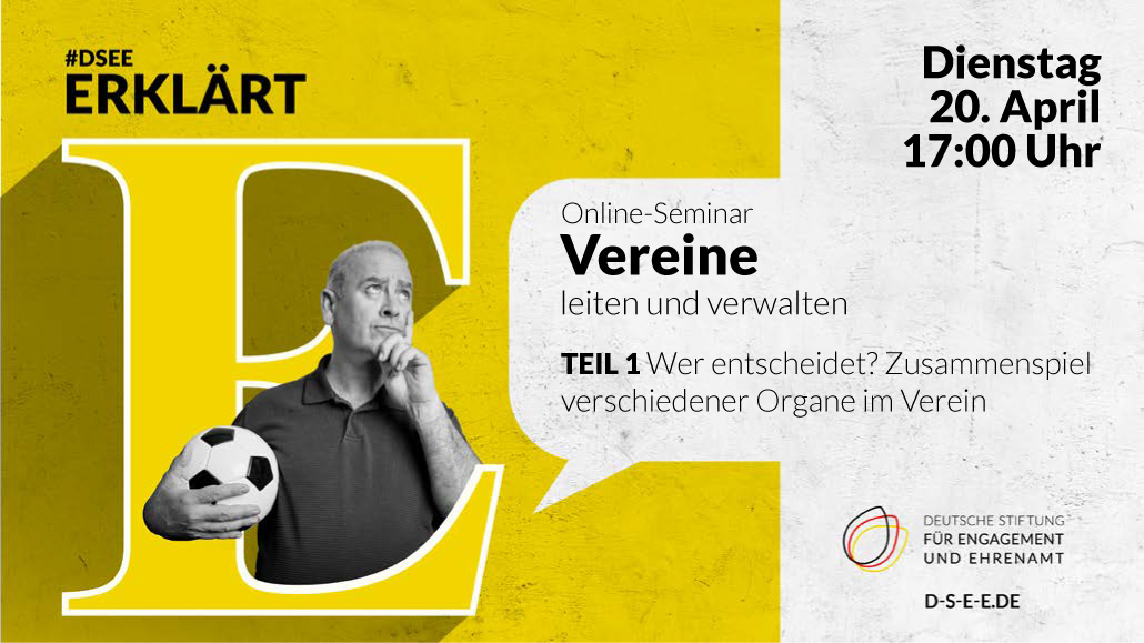 Die Veranstaltungen der DSEE bieten jede Woche auf die Bedürfnisse der Ehrenamtlichen zugeschnittene Informationen rund um Vereinsarbeit, Engagement und Ehrenamt. Scrollt durch den Kalender, um die kommenden Info-Veranstaltungen zu sehen oder klickt auf ein konkretes Webinar, um Details zu den Inhalten zu lesen und euch anzumelden.