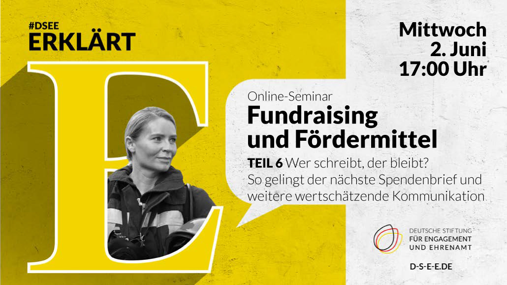 Die Veranstaltungen der DSEE bieten jede Woche auf die Bedürfnisse der Ehrenamtlichen zugeschnittene Informationen rund um Vereinsarbeit, Engagement und Ehrenamt. Scrollt durch den Kalender, um die kommenden Info-Veranstaltungen zu sehen oder klickt auf ein konkretes Webinar, um Details zu den Inhalten zu lesen und euch anzumelden.